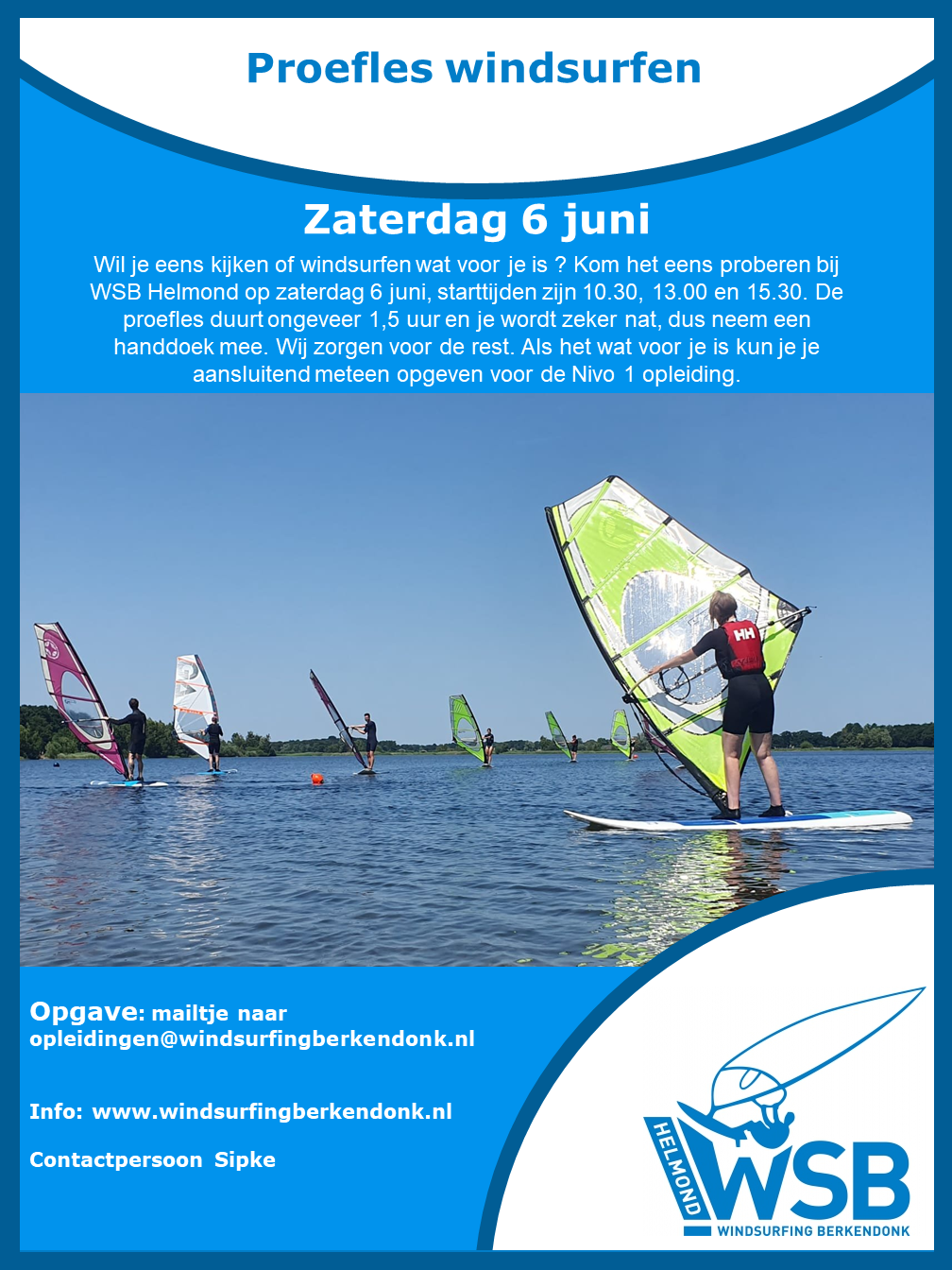 Op zaterdag 6 juni worden proeflessen gegeven bij Windsurfing Berkendonk. Vanaf 10.30 worden er die dag 3 lessen gegeven, de exacte tijd krijg je na inschrijving te horen.